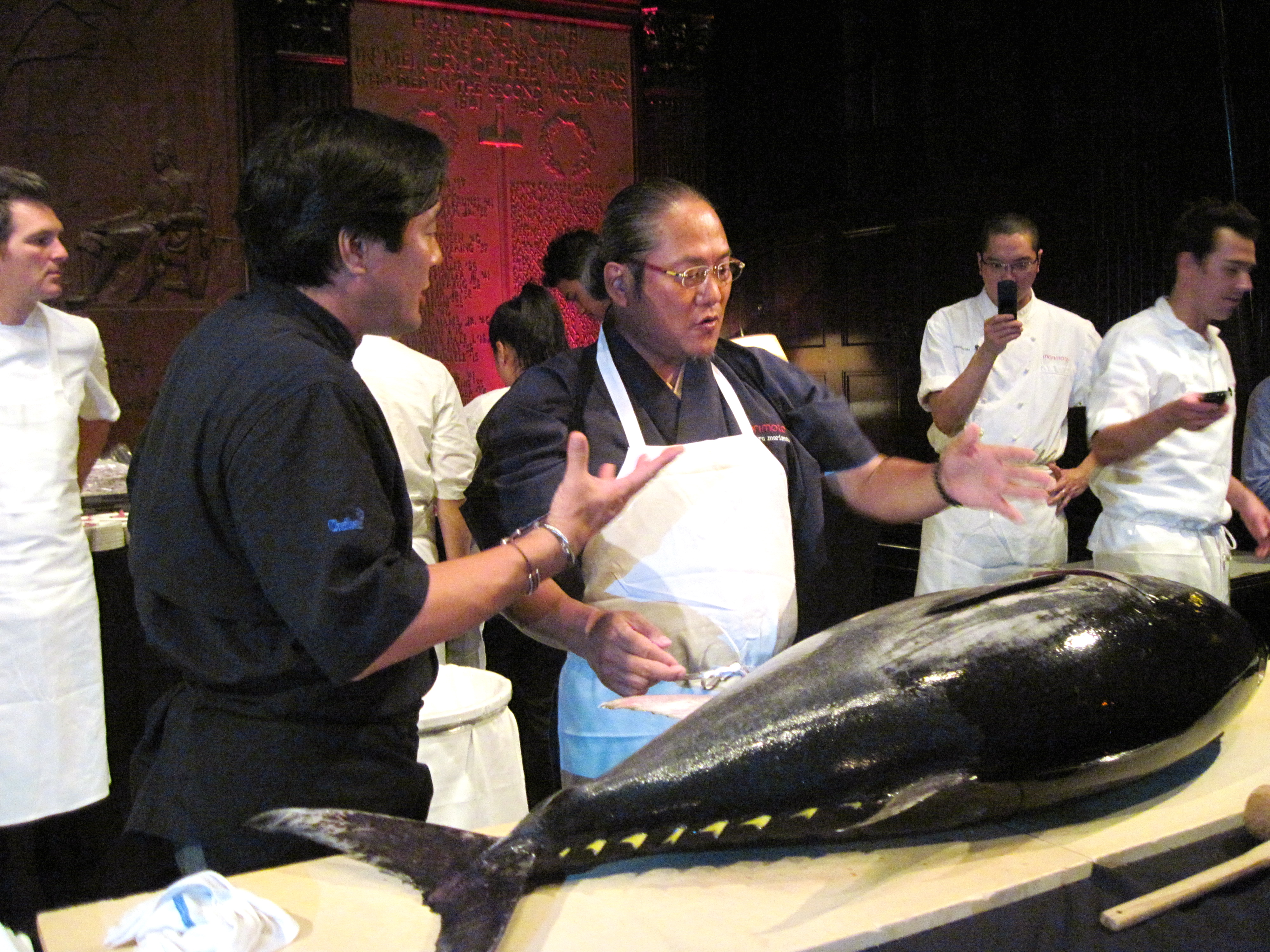 The New York Wine & Food Festival swept through New York City on Columbus Day weekend. If you’ve watched my Backyard Travel segments on NBC Nonstop, you’ll know that I’m on an ongoing quest for unique travel experiences in and around New York, and this is where the festival delivered: Highlights included a behind-the-scenes slaughterhouse tour in the Meatpacking District (stay tuned for a post on that); prohibition cocktails at the three-tiered bar 5 Ninth; and, one of my favorites, a night of two Iron Chefs and a tuna nearly the size of a Volkswagen Beetle – at the Harvard Club. Perhaps the most startling moment of the night was to walk in and see the massive tuna, with its glistening black scales and feathery fan of a tail, lying on a mahogany table in the middle of the Harvard Club.